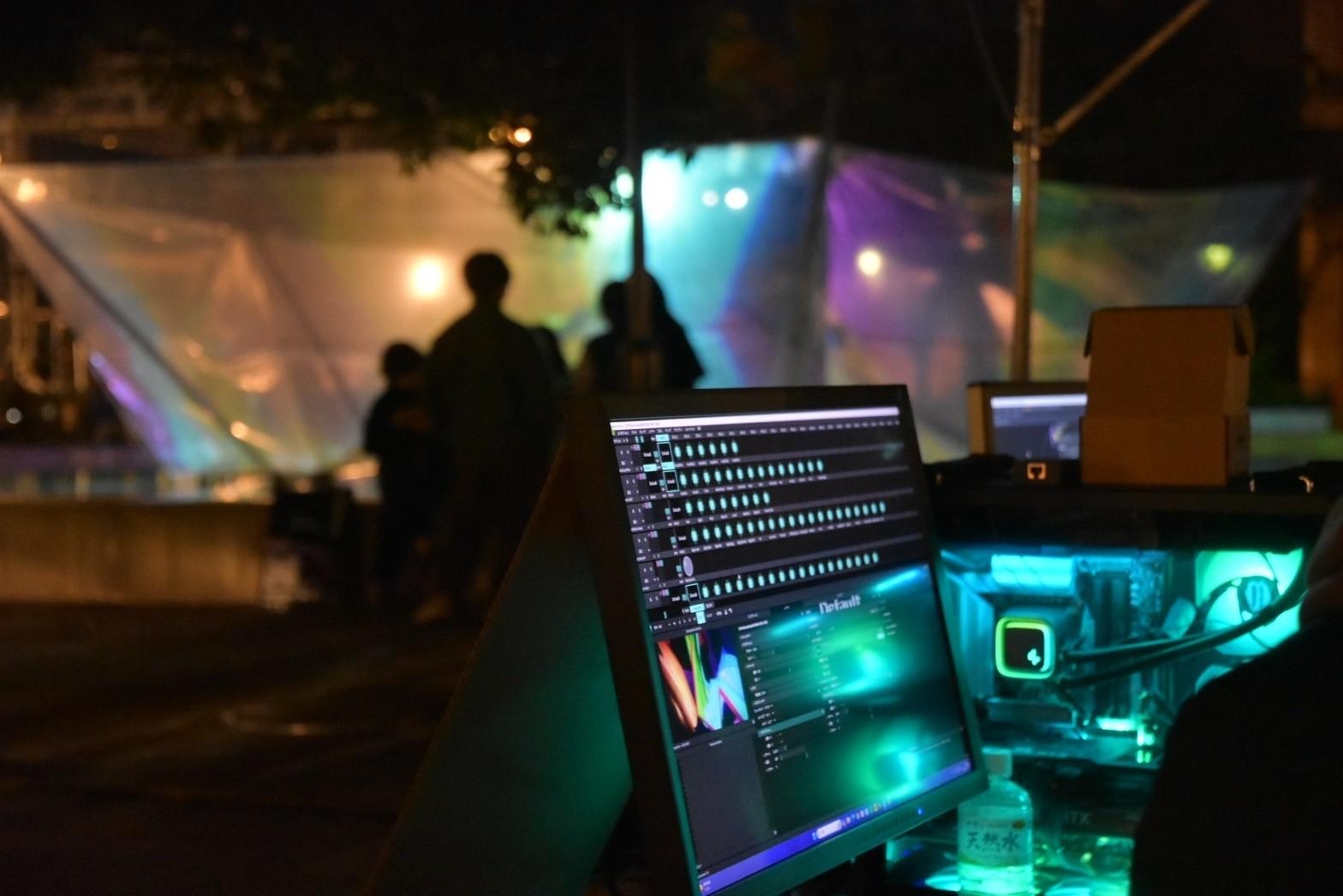 一つ一つの小さな人為や自然現象が水面上に浮かぶ光となり、風で波打つ水鏡によって多様に変化し混ざり合うことで一つの大きな光の彫刻となる。光の彫刻は昼間は太陽光が波打ち、夕方は噴水周りで現実とバーチャルの人為が混ざり合い、夜はDJステージの音楽と共に躍動する。無数のさざ波が集まって一つの流れをなすように、学園祭で繰り広げられるこれらの瞬間が光の彫刻の上で絶え間なく変化し続ける。電脳漣漪は、BKCランドスケープの中心である噴水でキャンパスと人々とを繋ぎ、学園祭という非日常を象徴する存在となる。