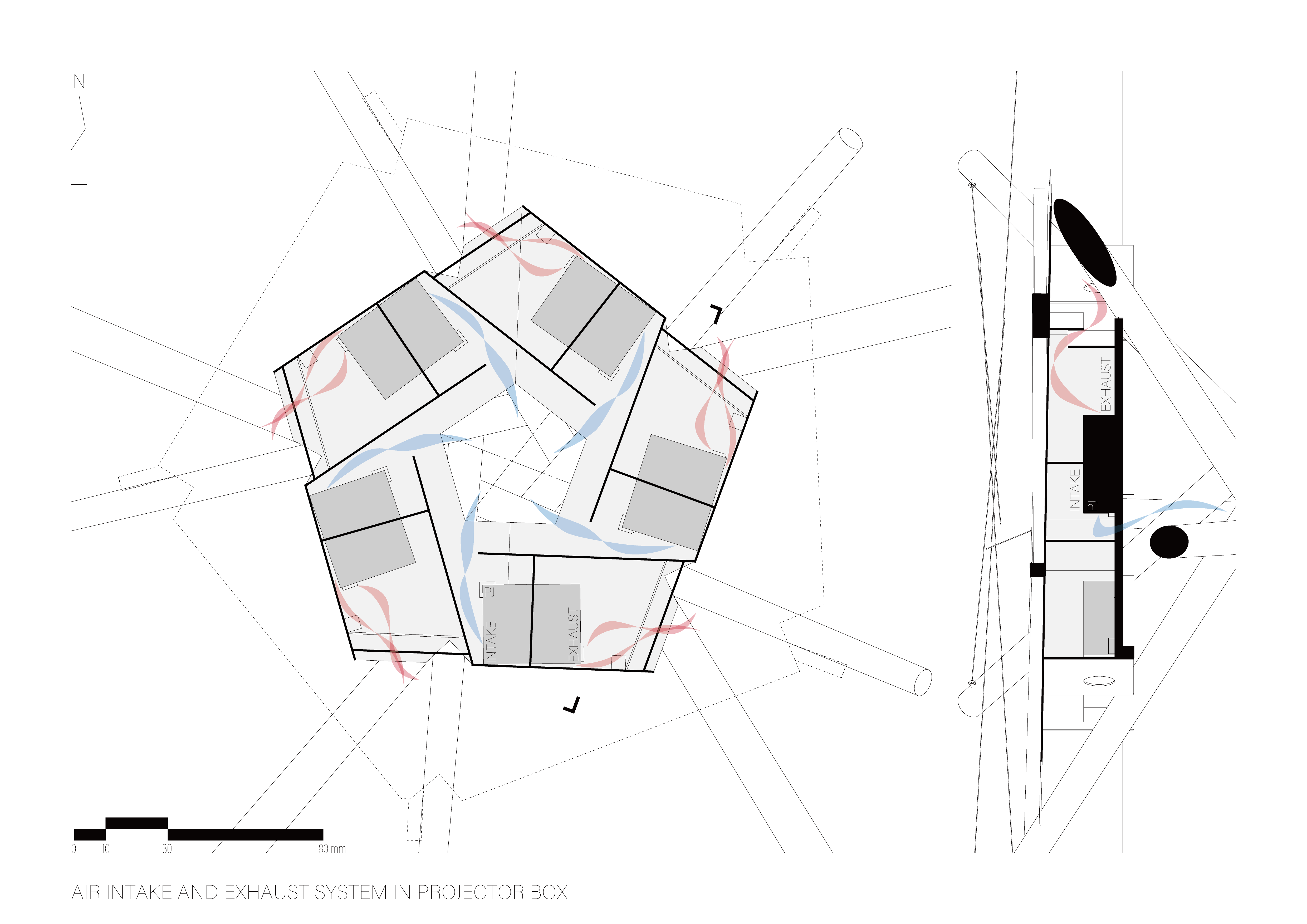 For ease of construction by students, we incorporated details such as post-adjustable wires with buckles, joinery that requires minimal processing, and the use of packers for screen attachment, all of which are cost-effective and easy to work with. To achieve seamless image projection, the projector uses partial overlap to eliminate the shadow created by the three-dimensional frame. The interaction with the visuals can be facilitated through a web application on smartphones, creating a sense of unity, centered around a fountain.